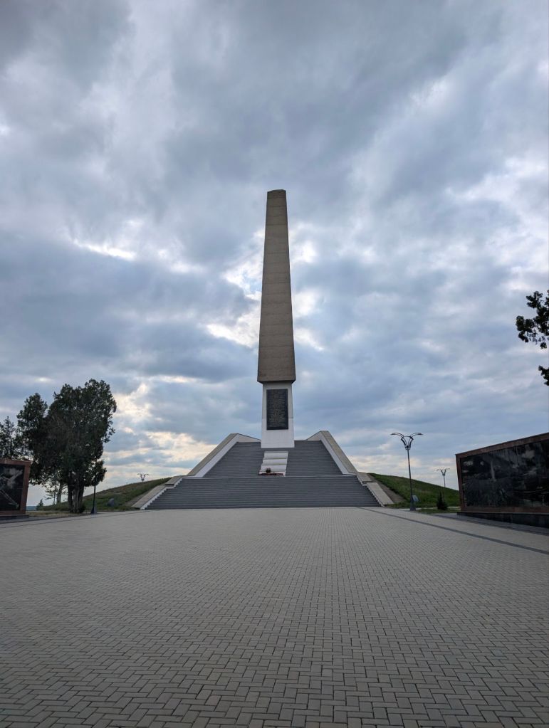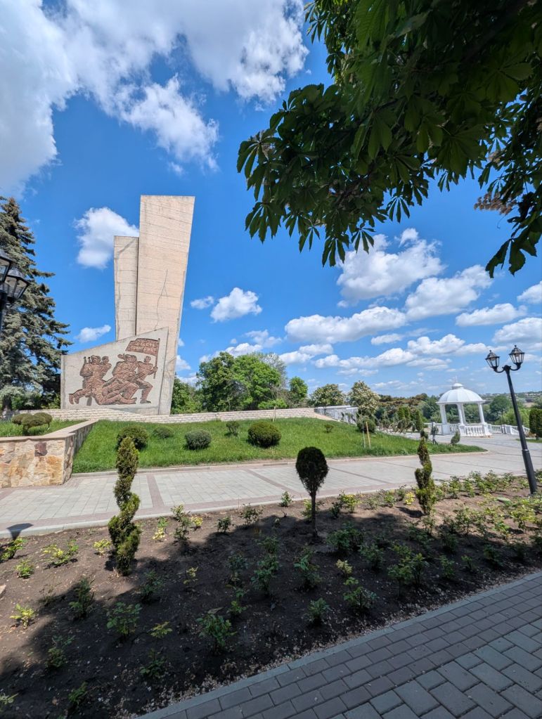 Soviet era monument and the new wedding pagoda in the park, Bendery.